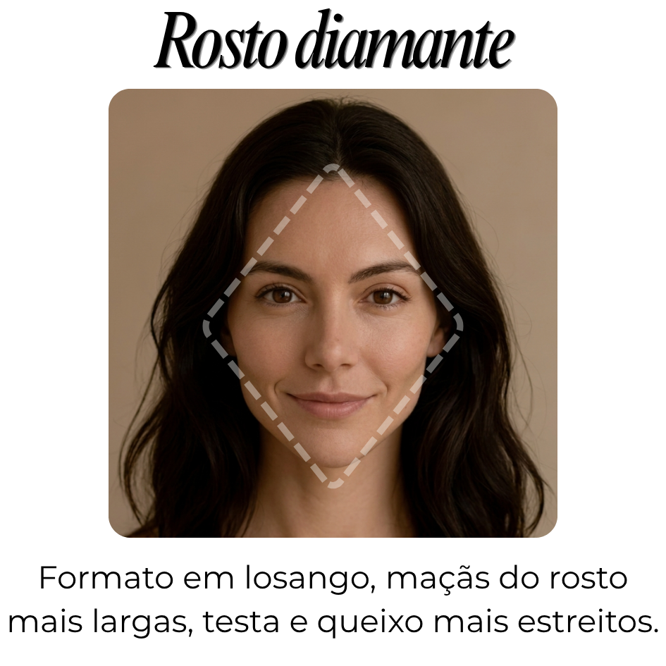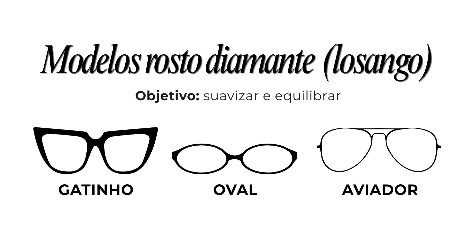 Indicação KAIZARA para rosto diamante: Óculos Raquel, Duna, Cora, Diana, Estela e Jade (clique sobre os nomes para conferir os modelos).
