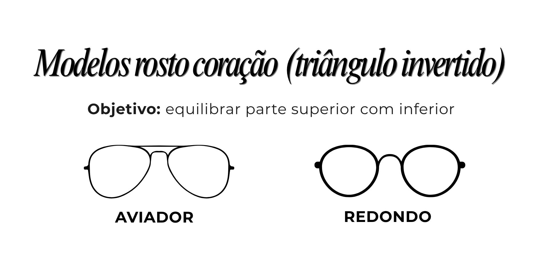 Indicação KAIZARA para rosto coração: Óculos Serena, Duna, Maya, Jade, Estela e Clara (clique sobre os nomes para conferir os modelos).